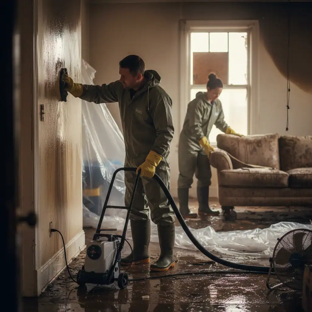 Schoonmaken en herstellen op de locatie van beschadigde ruimtes na waterschade.