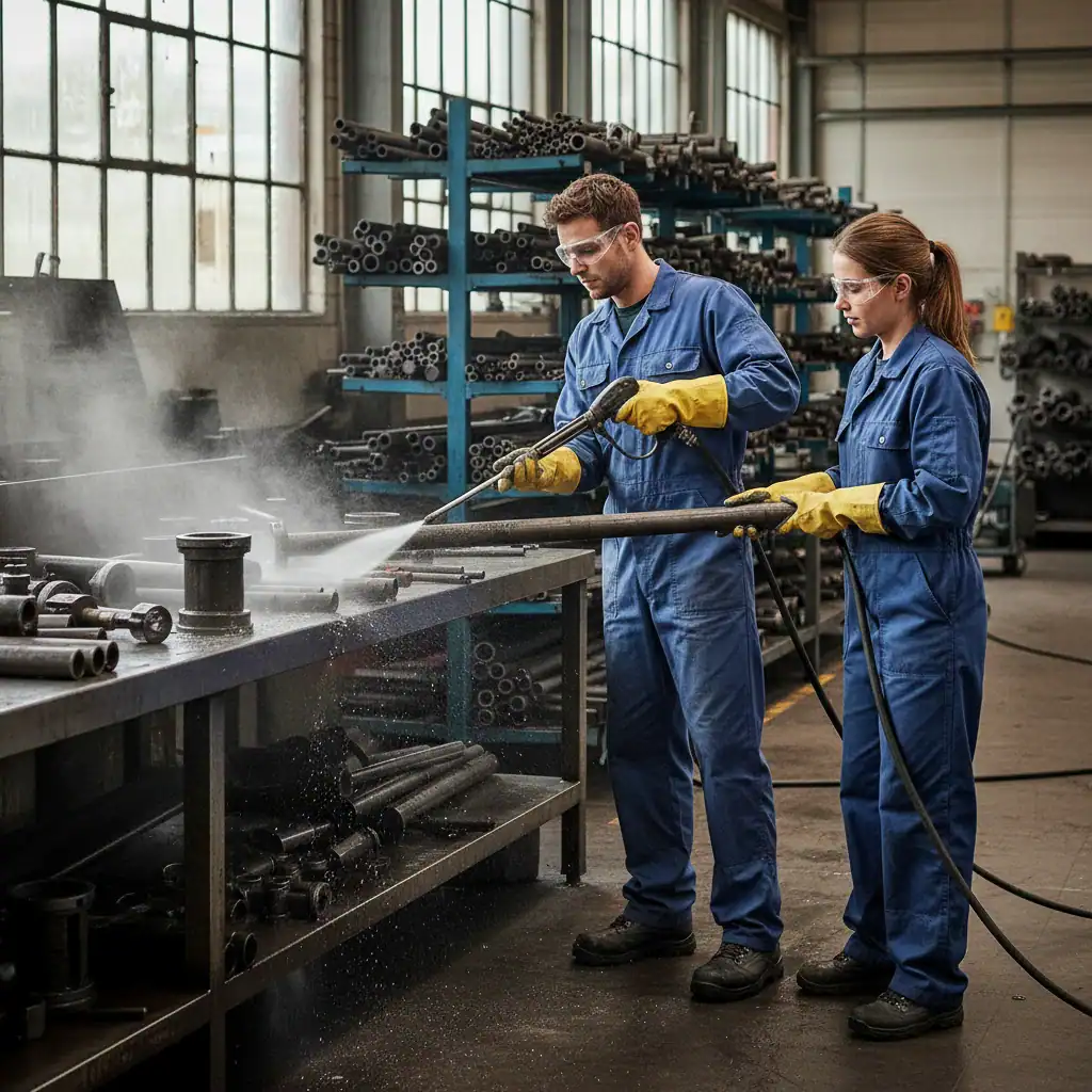 Als industrieel reiniger ben je verantwoordelijk voor het schoonmaken van stalen buizen en metalen voorwerpen die gebruikt worden binnen industriële toepassingen. Dit doe je voornamelijk met een hogedrukspuit, waarmee je de metalen voorwerpen schoon en chemicaliën vrij spuit.