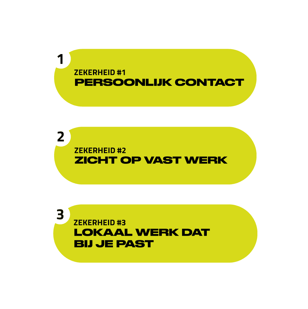 Werken via WerkTalent betekent dat je altijd zeker bent van onze drie zekerheden. Niet alleen tijdens de zoektocht naar een baan, maar ook wanneer je daar aan de slag gaat. Zo maken we het vinden van jouw nieuwe uitdaging nét iets waardevoller voor je.